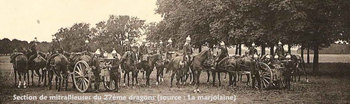Le régiment comprend deux sections de mitrailleuses portées sur deux voitures à deux roues tirées par quatre chevaux (voir photo ci-dessus). Sur d’autres voitures suivent les munitions et le matériel d’entretien. Sous les ordres d’un Lieutenant de cavalerie, notre grand-père, Maurice Petit, 24 ans, Maréchal-des-logis (nous sommes dans la cavalerie), commande une section monté sur sa chère jument Belle Lurette.